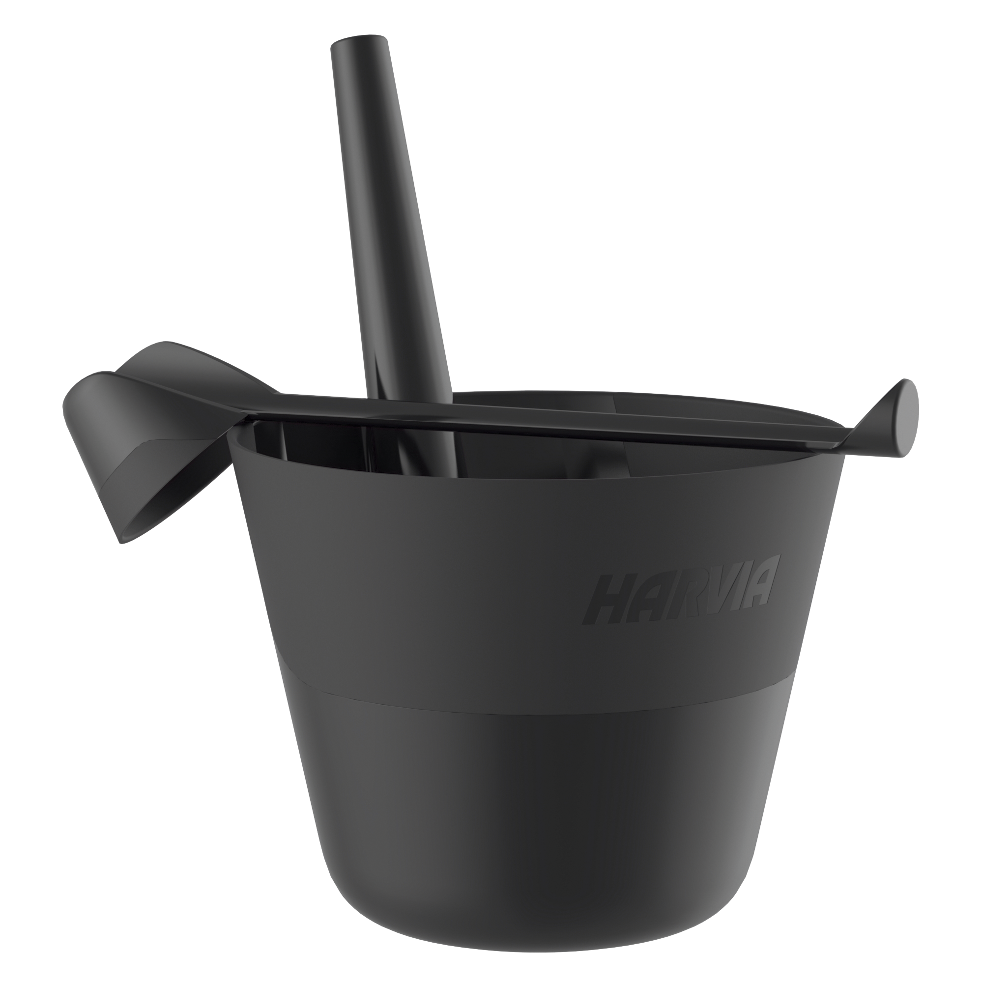 Juego de cubo y cucharón de plástico negro. Logotipo HARVIA